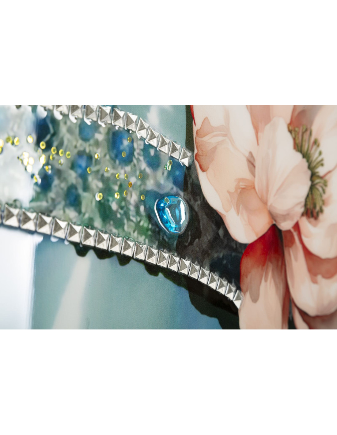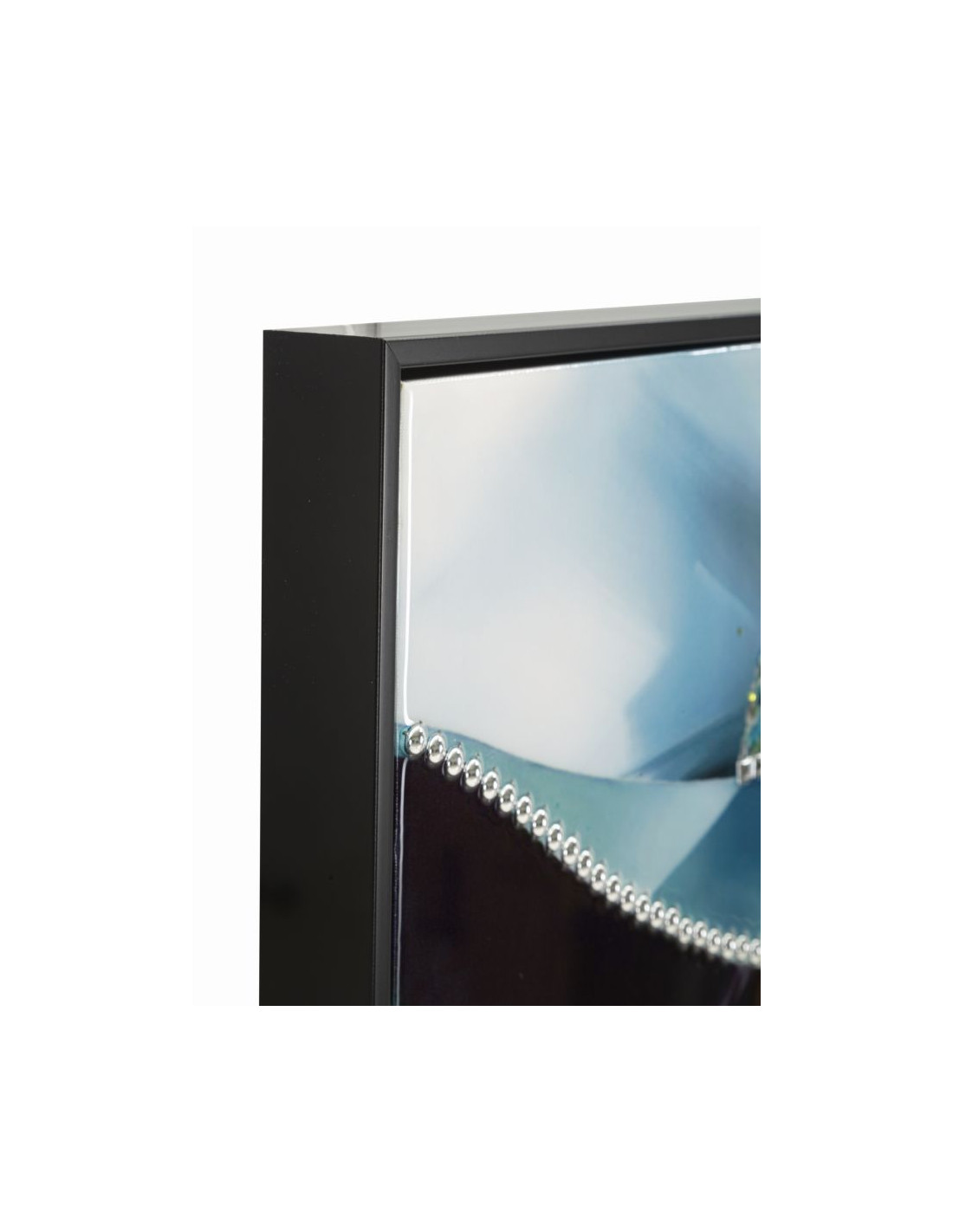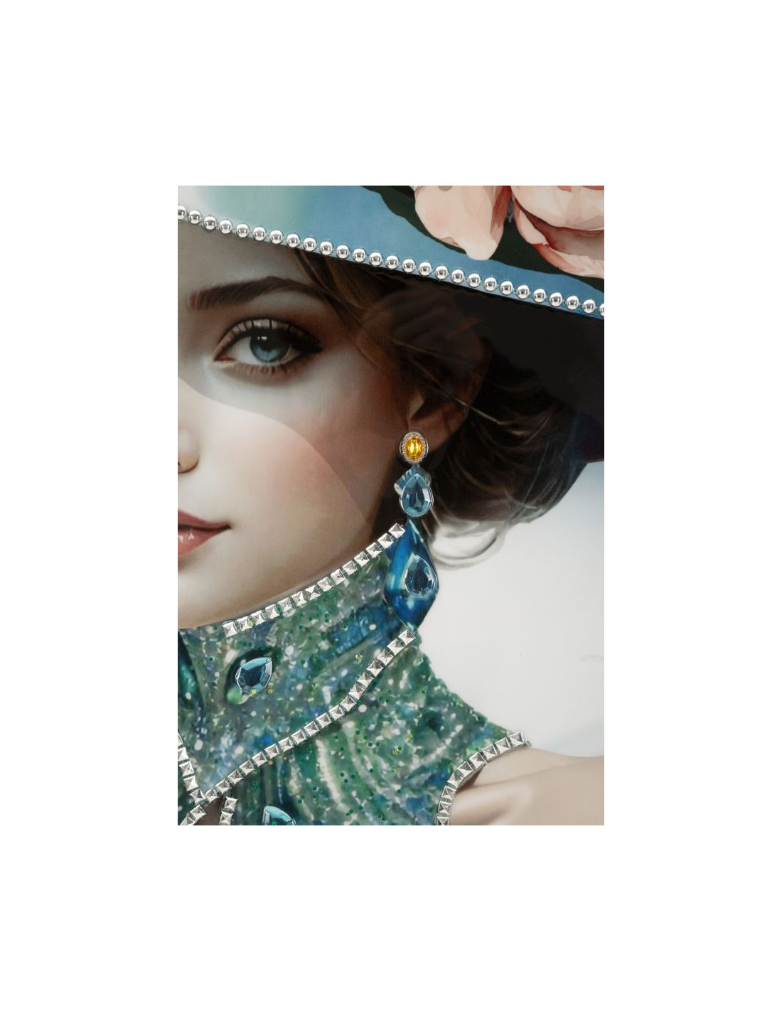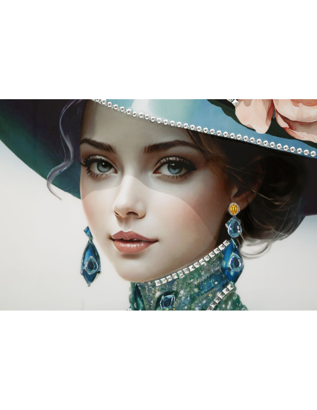 Toile murale peinte Femme chapeau bleu col bijou 62x92 avec cadre noir Pam