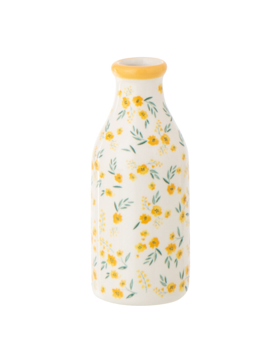 Vase Campagne chic Bouteille H 14 cm Dolomite Blanc Jaune Motif fleurs Flowa