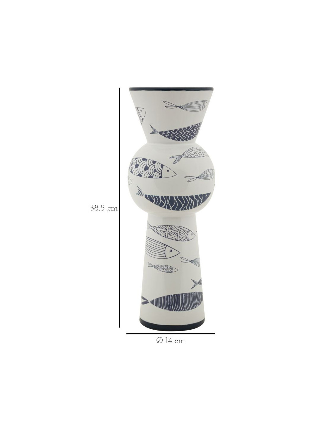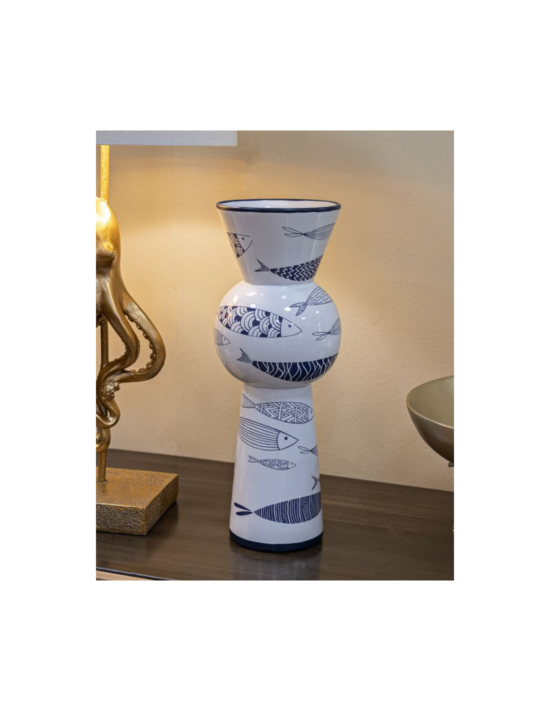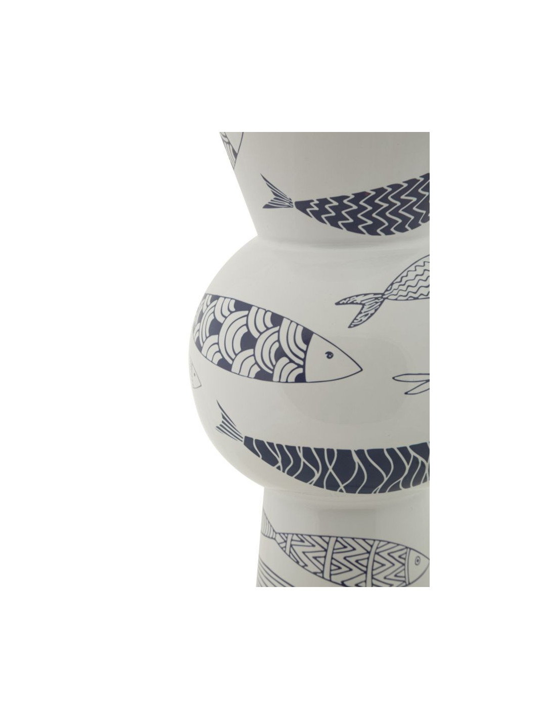 Vase design bord de mer Conique Hauteur 38 cm en Céramique Blanc Bleu Motif poissons Fish