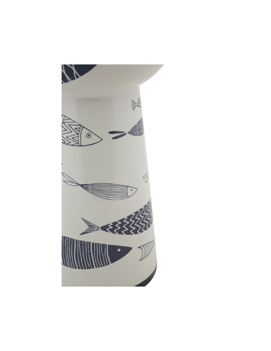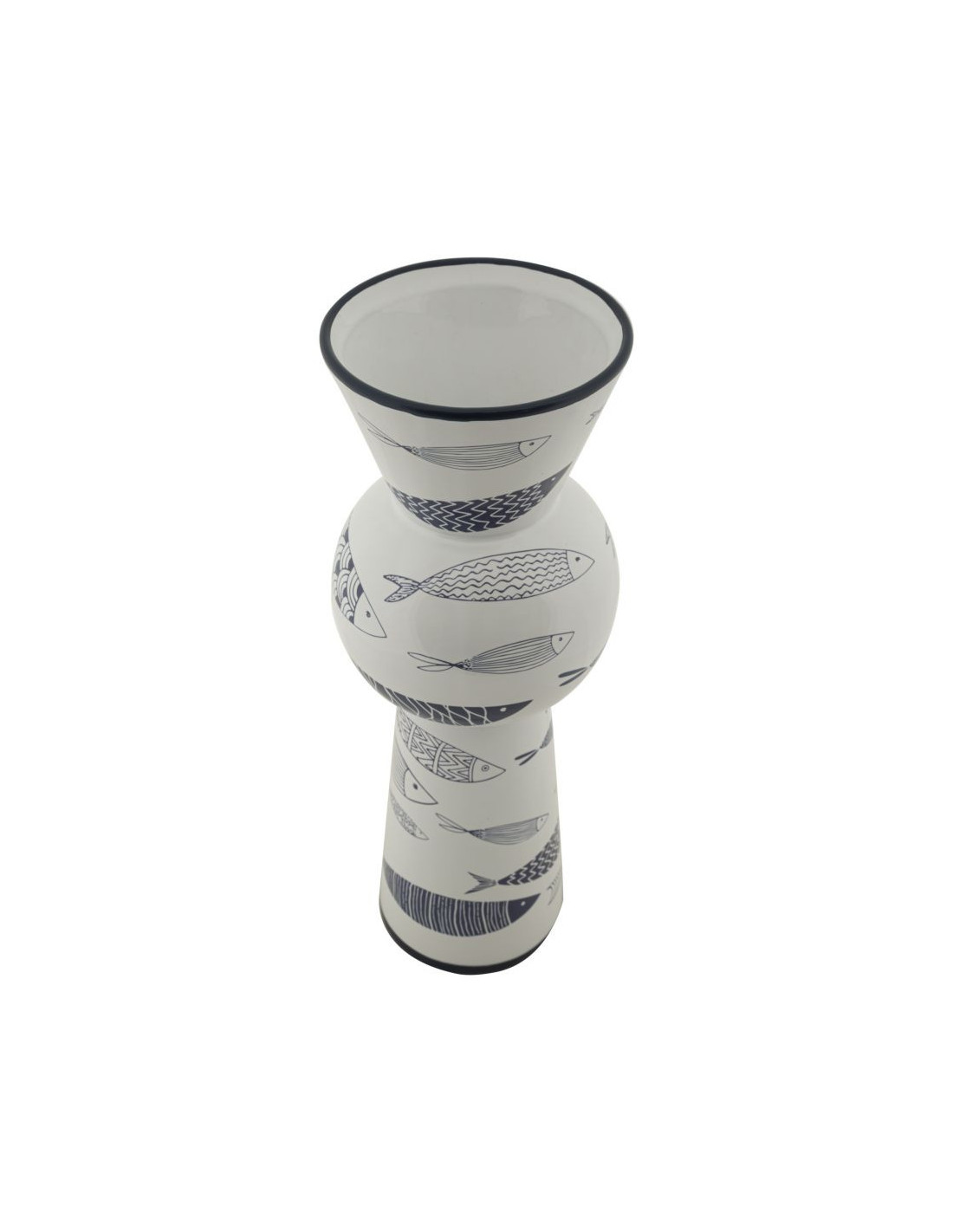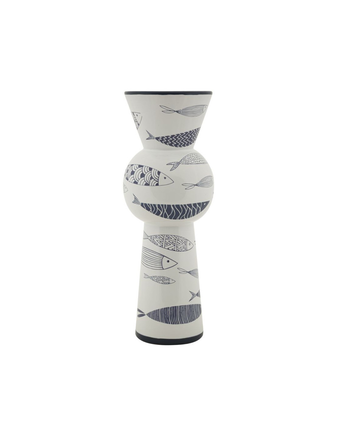 Vase design bord de mer Conique Hauteur 38 cm en Céramique Blanc Bleu Motif poissons Fish