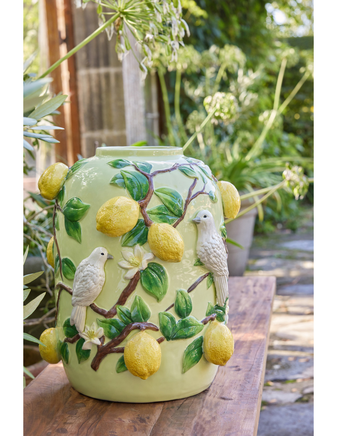 Vase design méditerranéen Oiseaux & Citrons H 35 cm Céramique Vert Jaune Zestinio