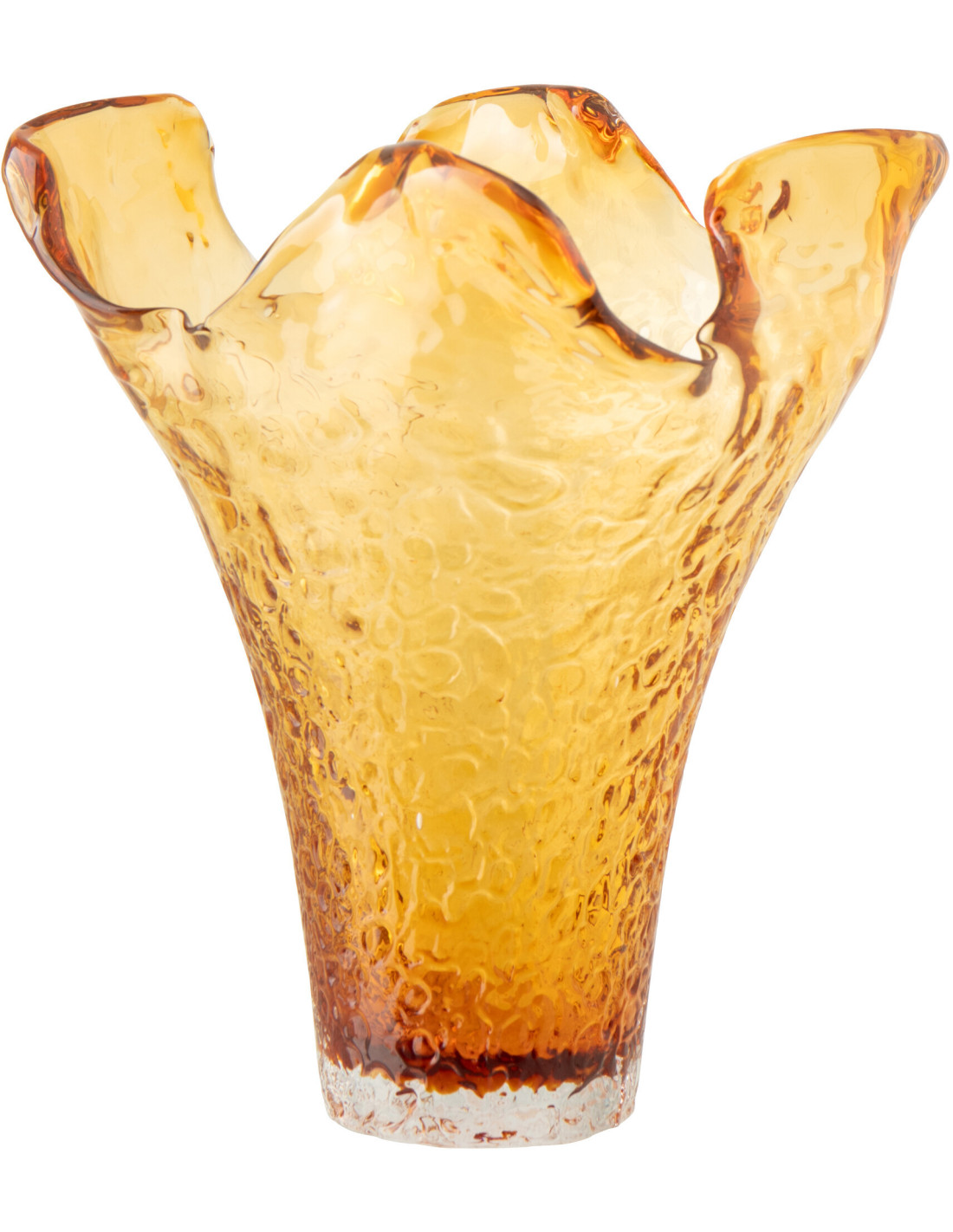 Un vase en verre caramel à la silhouette ondulée et irrégulière, conçu pour capter la lumière et attirer le regard.