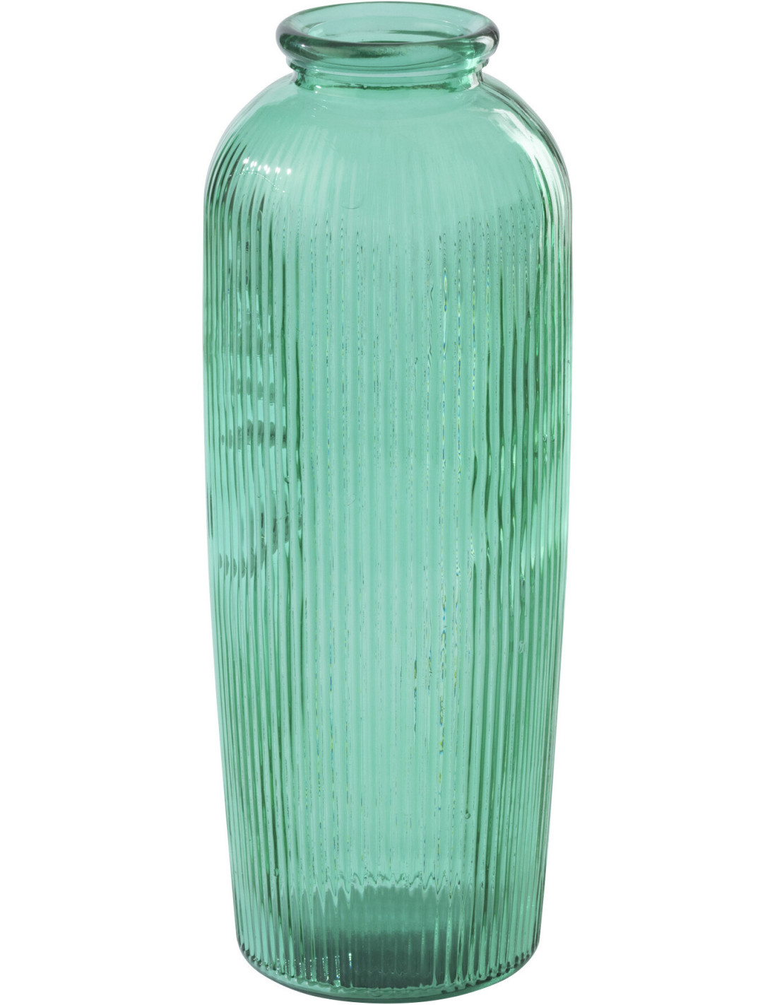 Un vase grand format en verre vert émeraude au relief strié, conçu pour structurer un espace et accueillir des compositions généreuses.