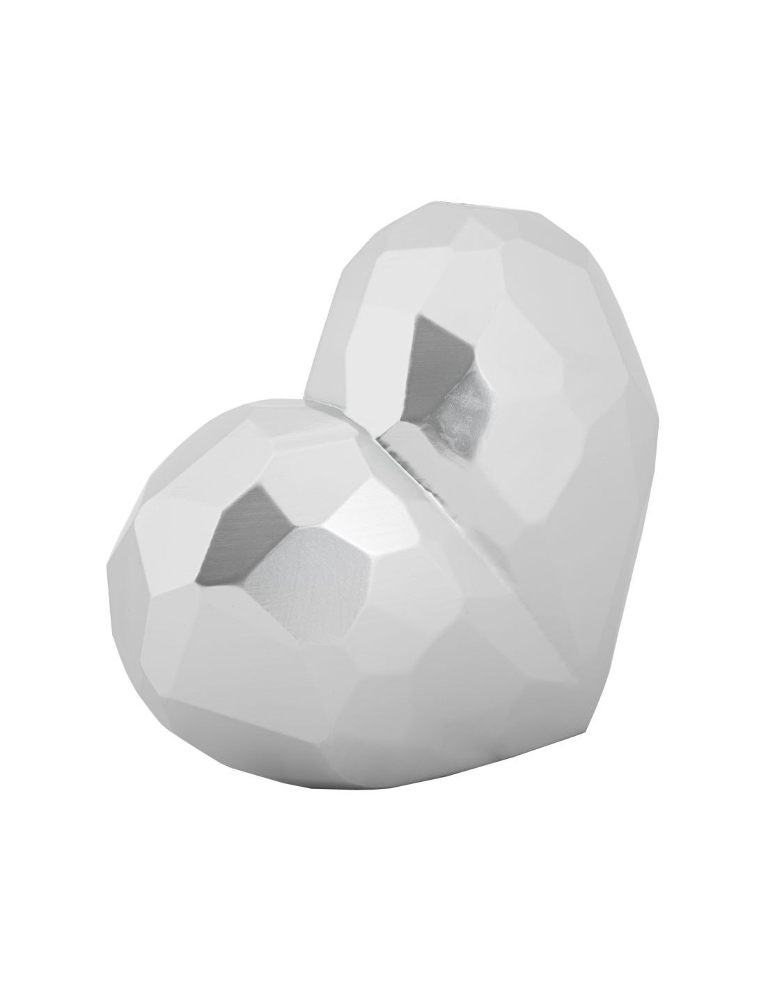Heart revisite le symbole universel de l’amour sous une forme géométrique facettée. En résine argentée, il attire la lumière et signe la décoration d’un éclat contemporain. Dimensions 19 x 19 x 18 cm.