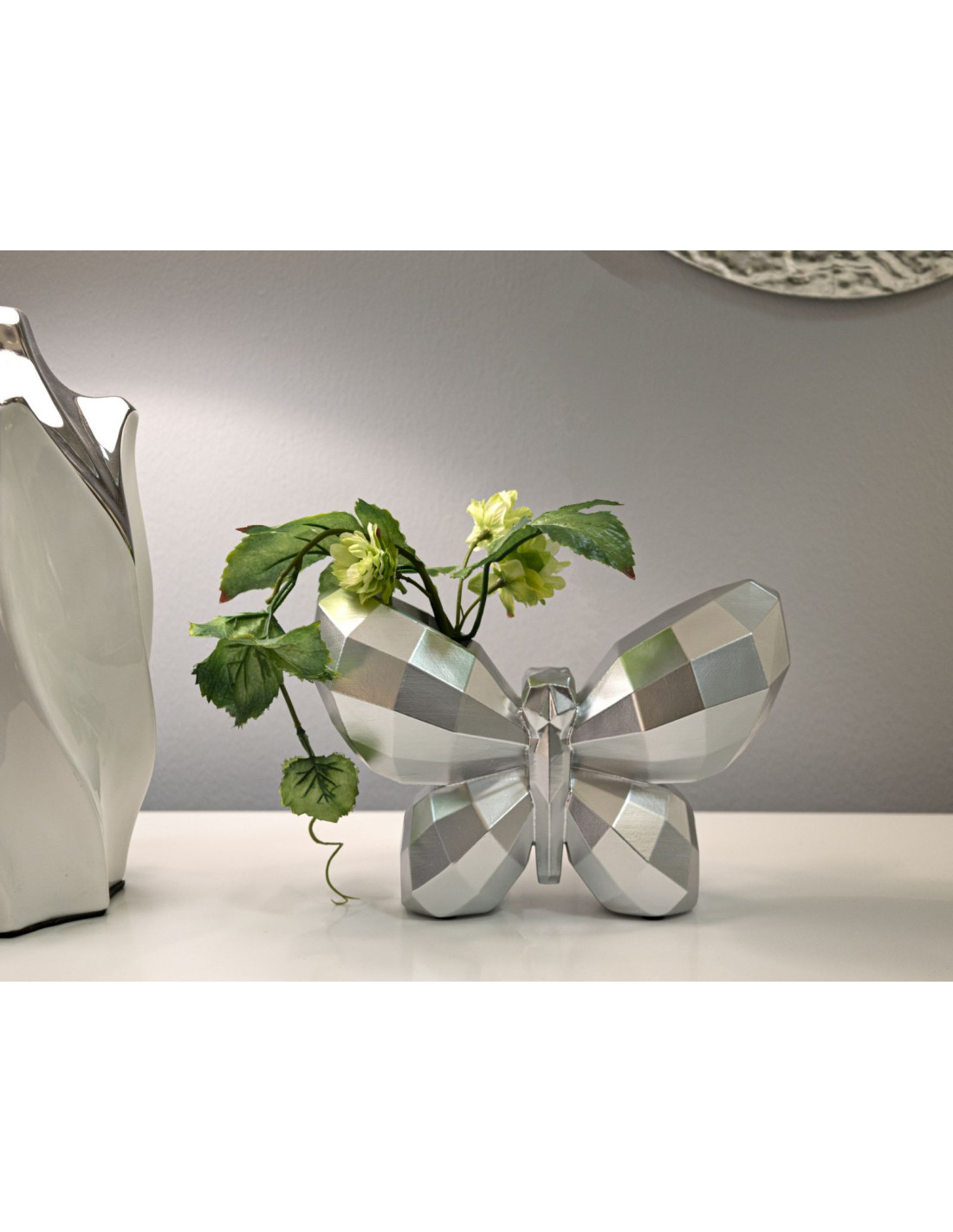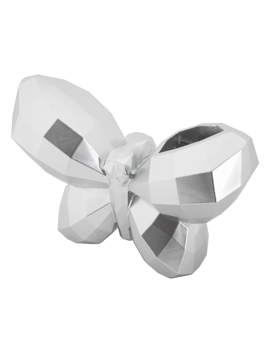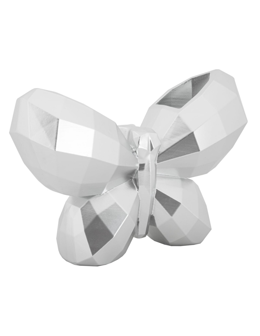 Butterfly est un vase décoratif en résine argentée dont le volume facetté capte la lumière. Son format compact 22,5 x 8 x 15 cm tient sur une étagère, une console ou une table basse.
