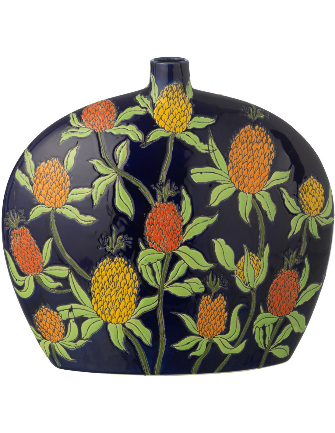 Vase Plat style art déco végétal Ovale H 30 cm Porcelaine Bleu Motif ananas Noctiflo