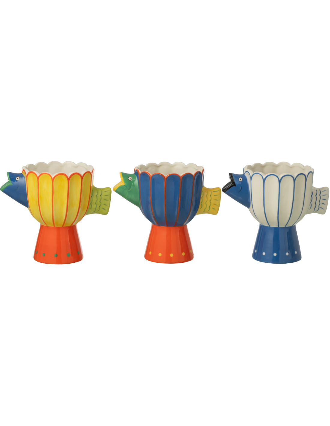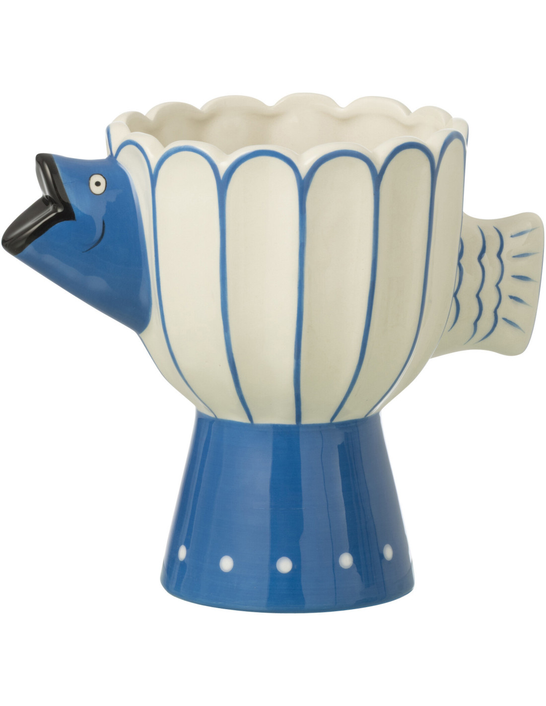 Ce vase revisite la forme iconique du poisson avec un décor plus rythmé, mêlant lignes verticales et pois délicats. Un équilibre parfait entre structure et fantaisie.