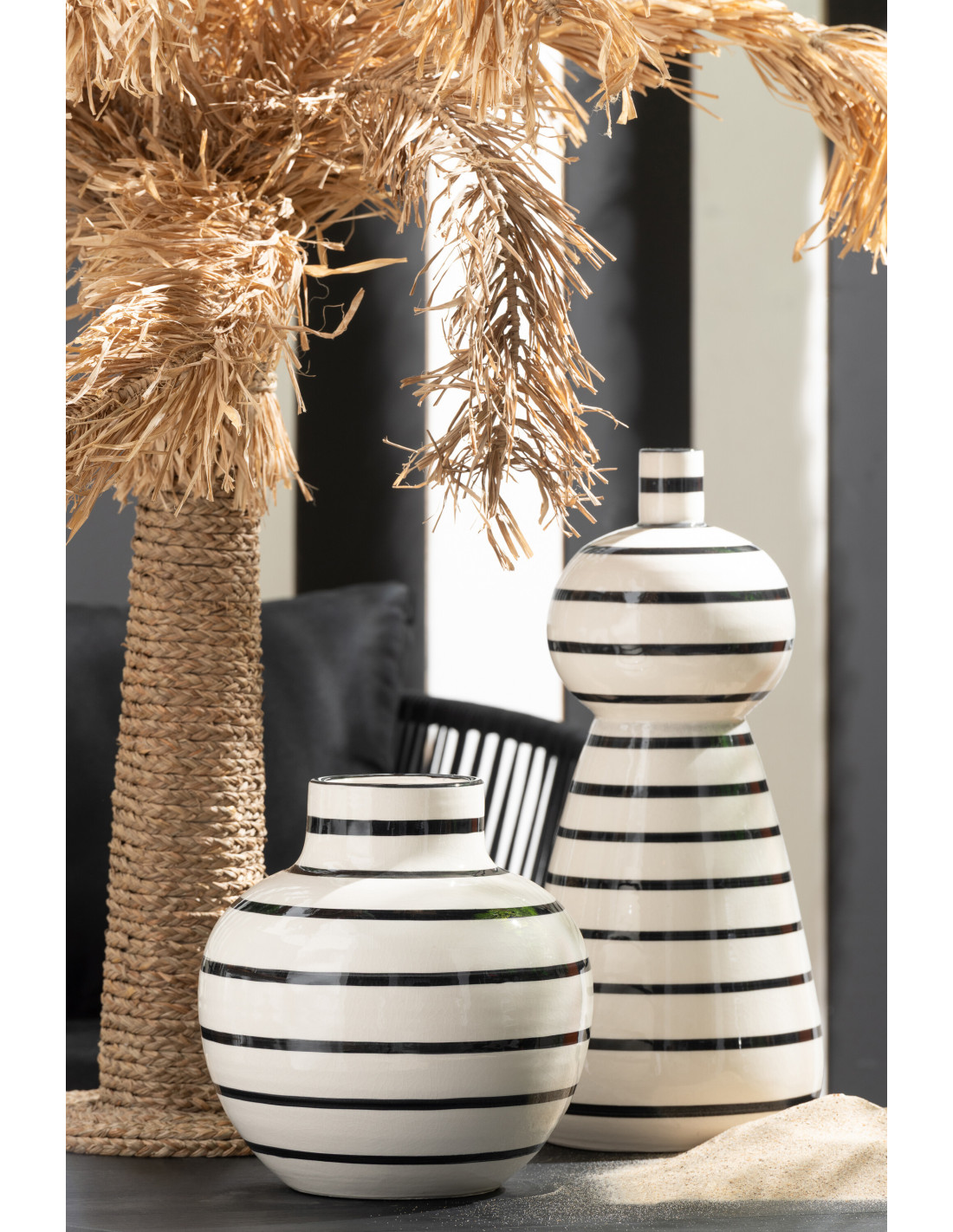 Vase style bord de mer Boule H 26 cm Céramique Blanc Noir Motif lignes Norlda