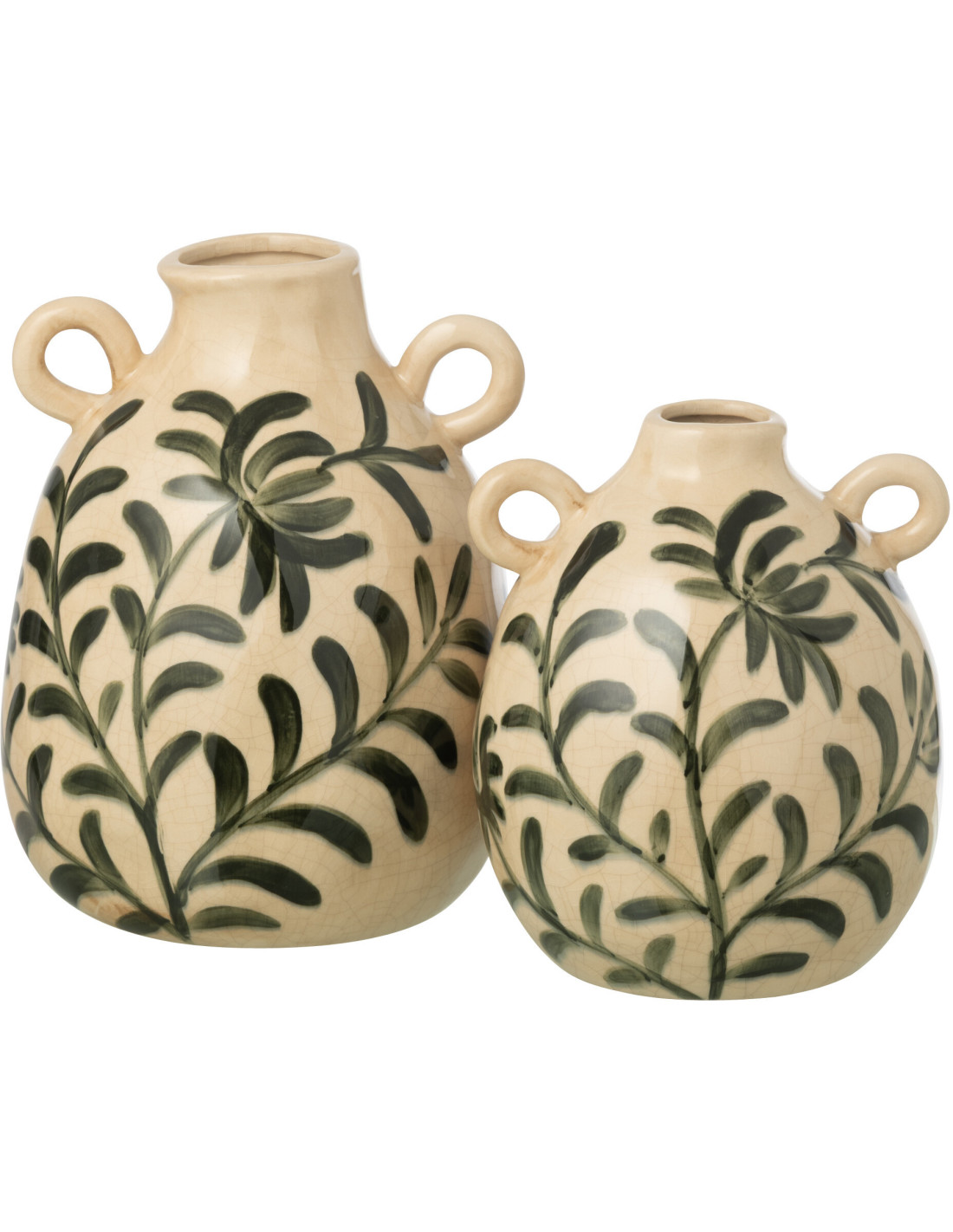 Vase style méditerranéen avec anses Amphore H 27 cm Grès Blanc cassé Vert foncé Motif feuillage Verdania