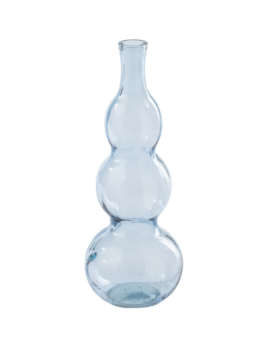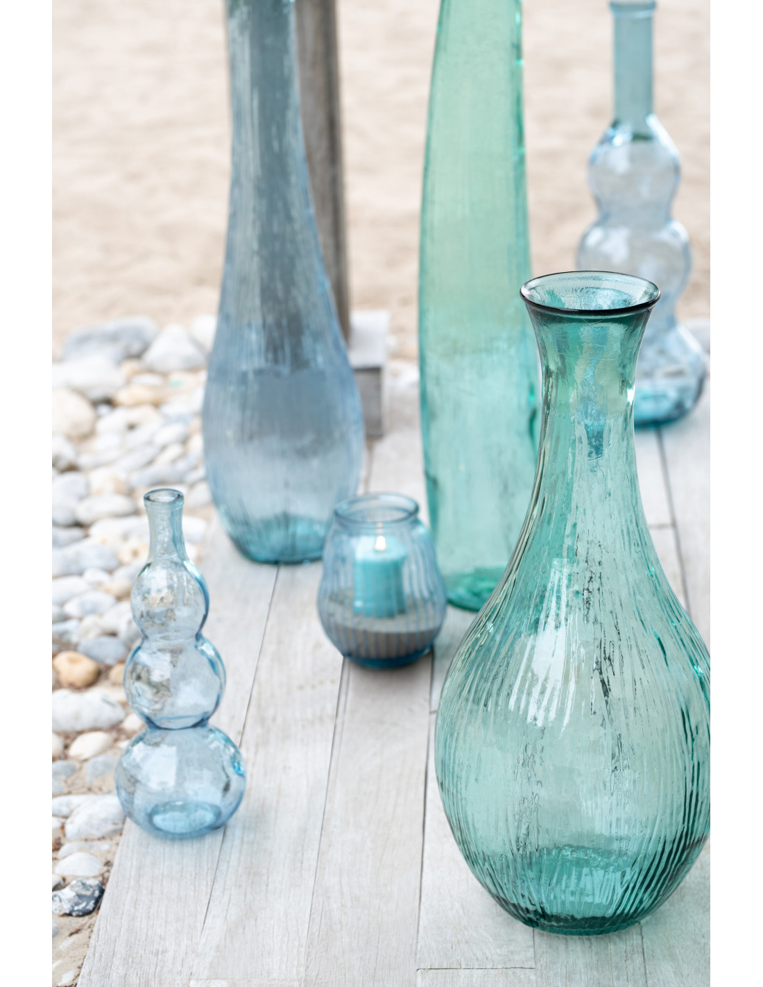 Verre teinté bleu clair avec finition lisse et formes sculptées.