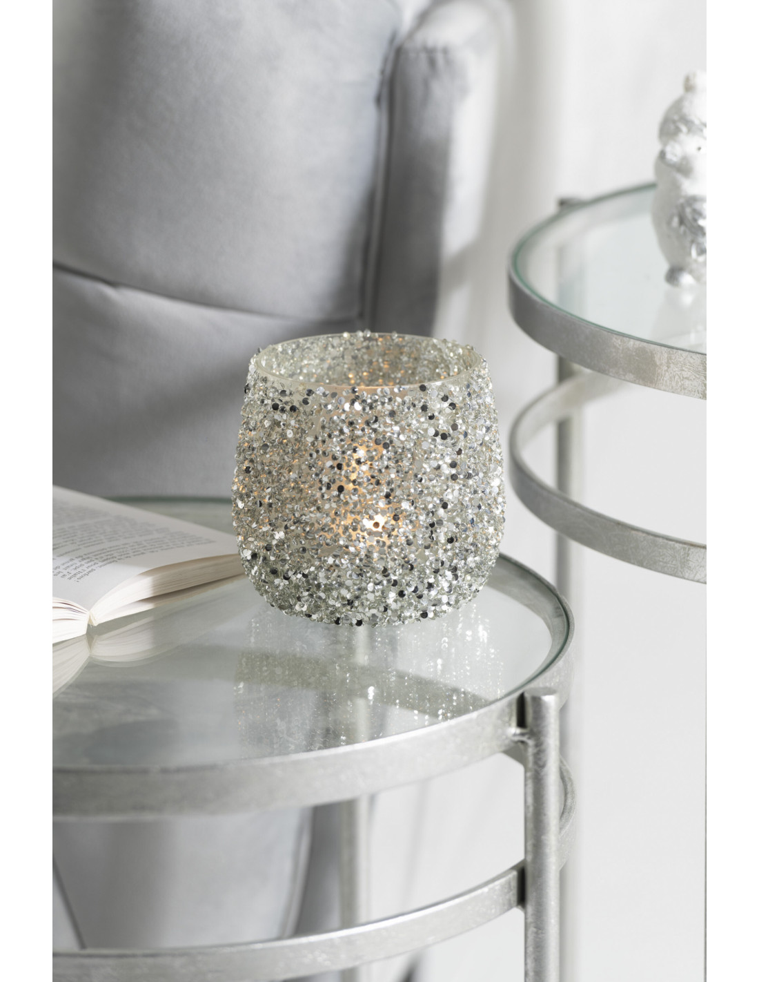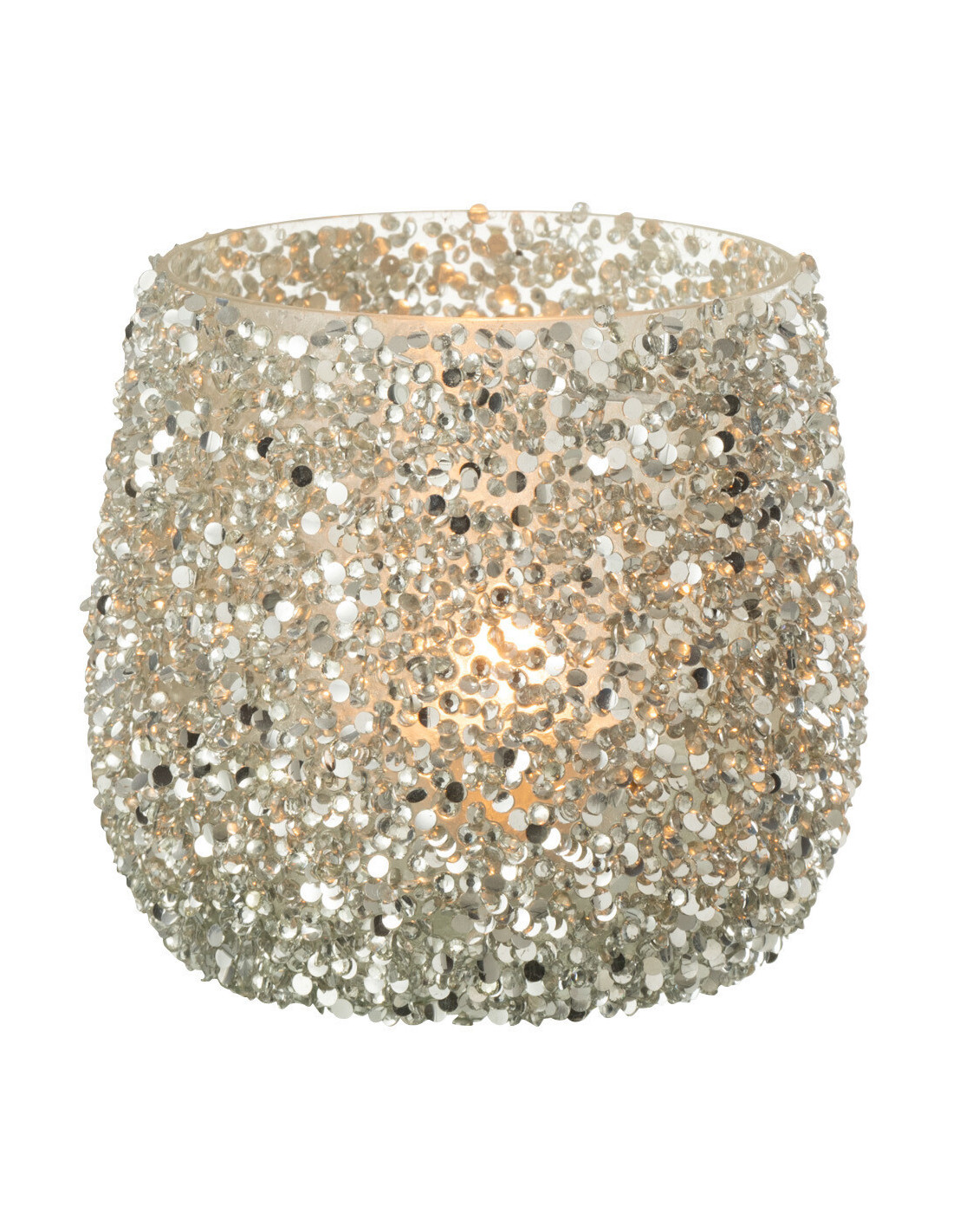 Photophore en verre avec paillettes argentées 10 cm